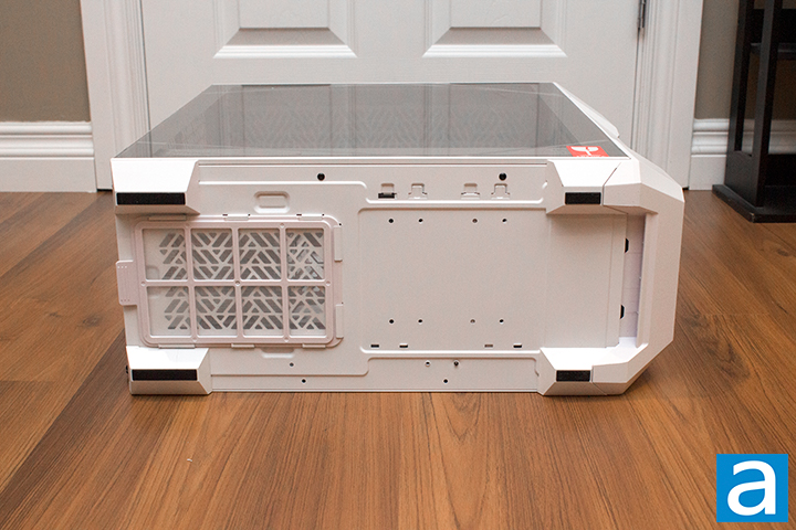 The bottom of the Cooler Master MasterBox TD500 Mesh V2 has four rectangular feet. When moving the case around, I found the case to be stable enough with all the components installed to add weight. The rubber pads on the feet are decently sized, measuring 35mm in length and 10mm in width for the front and 60mm in length and 10mm in width for the back. These feet provide about 20mm of clearance, which is enough space for the PSU airflow. There is a dust filter designed for the PSU. The dust filter is simple to remove as you can simply pull the tab from the back of the case. Might I say, this is exactly what I said they should do in my review of the MasterBox TD500 Mesh and I am glad to see it here.