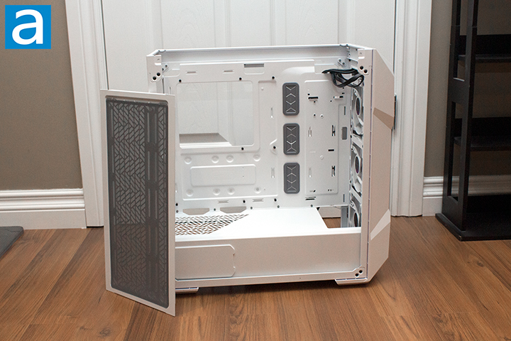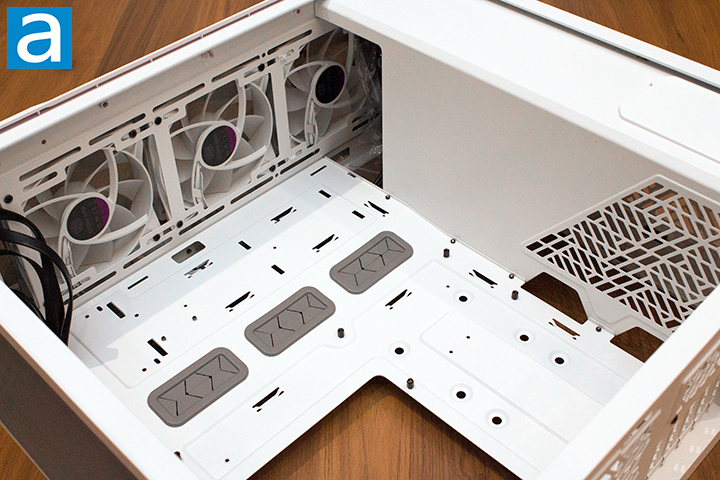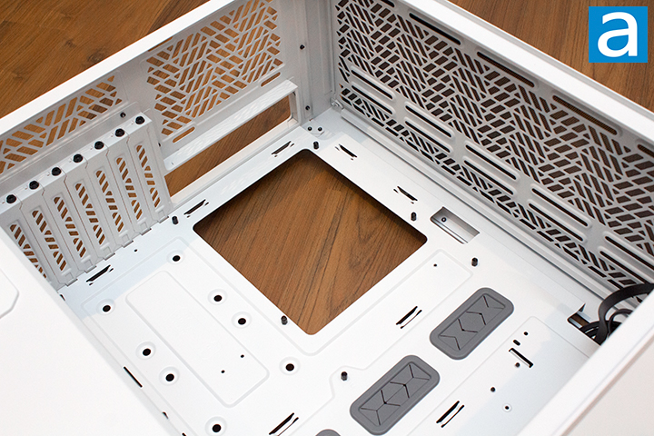 After removing all the side panels, we can have a closer look into the interior of the Cooler Master MasterBox TD500 Mesh V2. The white color scheme remains constant throughout the entire chassis. The power supply shroud covers practically the entire bottom of the case, leaving cutouts for cable routing, fans, and a radiator near the front. I am personally happy to have the option to leave the PSU exposed or covered. We have very little space underneath the shroud, given how there is a drive bay here as well. This will make cable management a bit trickier, even though it is a mid-tower. The drive bay is also removable if you do not install any hard drives, allowing you to deal with this issue. There are two breaks in the PSU shroud to allow for cable routing. Additionally, there are three rubber cable grommets beside the motherboard tray to pass cables from front to back with a clean appearance. I personally love cable grommets, because they look better than cutouts placed on panels. They also add some sort of contrast against the full white interior.