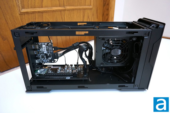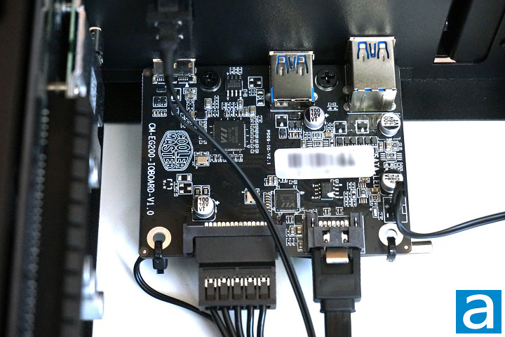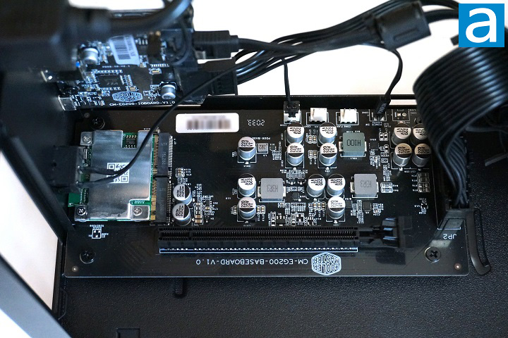 After removing the side and top panels, we can see the inside layout of the Cooler Master MasterCase EG200. Unlike a conventional computer case, the PSU is located behind the front panel, so an extension cable is used to connect the power connector on the case and the PSU. There are two PCBs in the EG200. The one with a PCIe slot is for the bridging of Thunderbolt 3 and PCIe, and the other one is for the USB hub functionality. The USB hub board also connects to the front SATA port. As you can see, the Thunderbolt 3 functionality and the USB hub functionality of this case are provided by two independent modules for maximum performance.