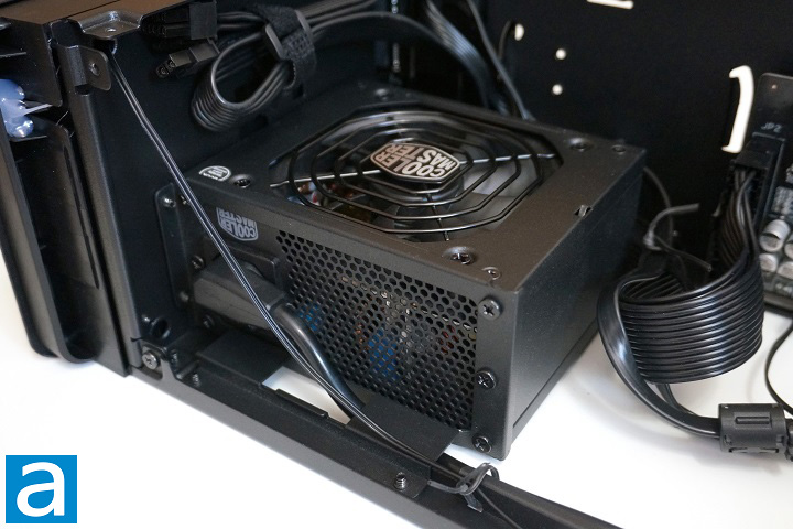 The overall layout of this external GPU enclosure is well-designed. The graphics card with dimensions up to 325mm long, 54mm thick, 141mm wide is supported. The graphics card can be easily installed, since it is not blocked by the PSU or any other modules. One thing I would like to point out is the cable management of the EG200. All the cables in the case, except for the PCIe power cable, are tied to the chassis using twist ties instead of zip ties or Velcro straps from the factory. I guess Cooler Master just wants to give us the freedom to reroute the cables using the zip ties provided in the accessory bag. As for the PCIe power cable, it can be attached to the chassis with the Velcro strap that is already attached to the case.