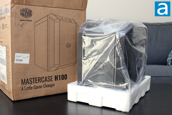 Out of the box, we can find the Cooler Master MasterCase H100 in a large plastic bag and held between two large white foam brackets. These brackets ensure the case is kept secure and protected while in transit. Some documentation is also included with the MasterCase H100, which mostly includes installation instructions and some warranty information. Just so you know, Cooler Master covers their cases for one year, which seems like a standard amount, aside from the electrical components, which are covered for an additional year. Otherwise, let us get a closer look at this little case.