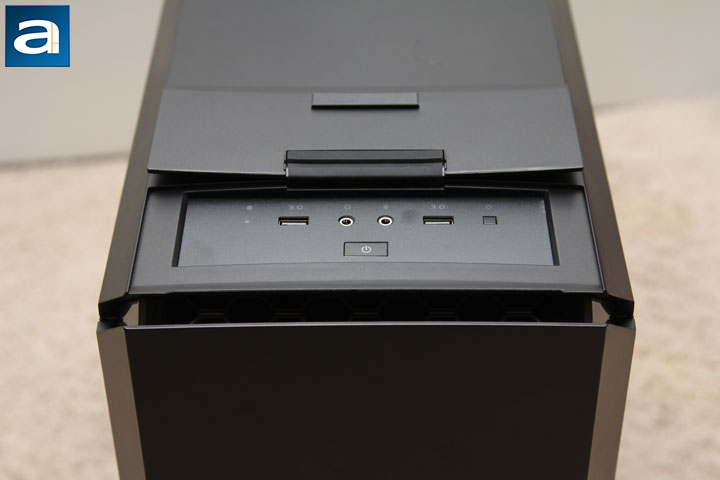 To provide access to the front I/O ports and switches, a small hatch cover on the top cover panel needs to be flipped over. Under the hatch cover, the power switch and reset button, two USB 3.0 ports, audio jacks for headphone and microphone are lined up, respectively. The power switch is located right in the middle, and illuminates after power is turned on. The hinge of the hatch cover is a piece of rubber. Compared with a mechanical hinge, the rubber hinge allows for a lower profile and smoother operation. When the hatch cover is closed, the top cover panel is really sleek and clean. Normally, since the water cooler radiator may be installed at the top of the computer case, opening or mounting holes are unavoidable here. However, in this case, everything that may reduce the cleanness of this computer case are well hidden under the poppable top and front cover panels. Meanwhile, like I have introduced previously, better ventilation can be supported by popping cover panels up.