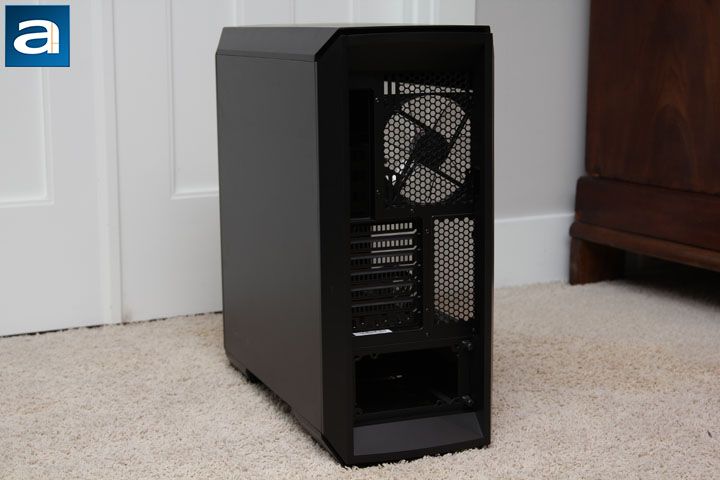 The back of the Cooler Master MasterCase Pro 6, like the rest of the case, is designed to be simple and clean. There are four major sections; namely, the power supply mounting place, motherboard I/O backplate, rear exhaust, and expansion card slots. According to the shape of the power supply mounting hole, the power supply is horizontally mounted at the bottom section of the chassis. Due to the computer case’s modular feature, the PSU is mounted on a removable plate. Thumbscrews are used to secure the PSU mounting plate to the chassis. Since the power supply has already taken this bottom position, the motherboard can only be located above it, meaning the I/O backplate opening is at the top. There are seven expansion slots available on the MasterCase Pro 6, which is standard for an ATX mid-tower. You may not be able to install a graphics card at the bottom slot though. Note the thumbscrews of the left and right side panels are hidden under the removable back cover. The back cover can also provide cable management to the wires coming out from the motherboard I/O connection. As for the rear exhaust, as you can see from the photo above, there is a 140mm LED illuminated fan included from the factory.