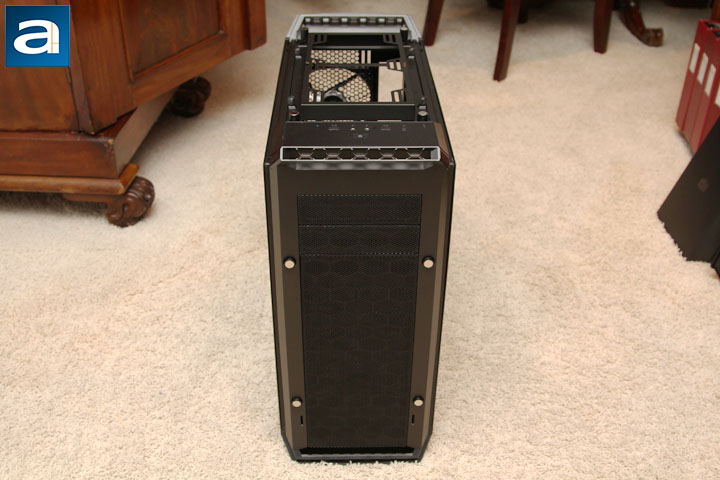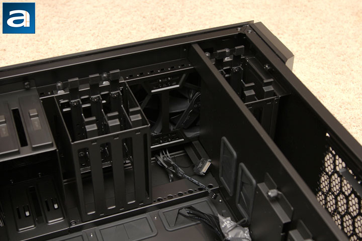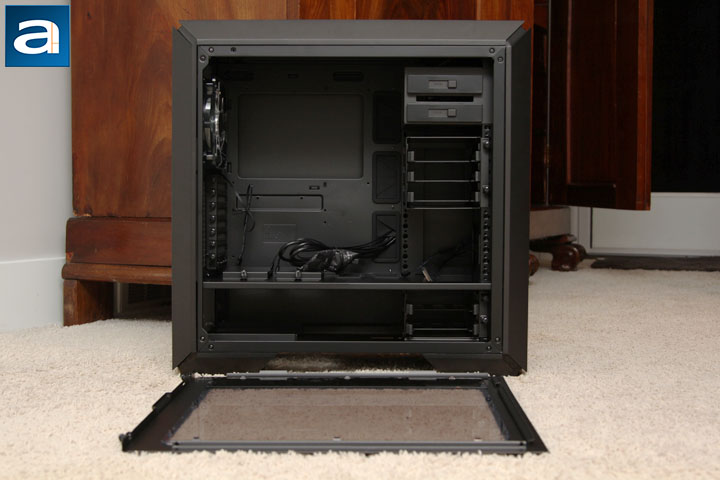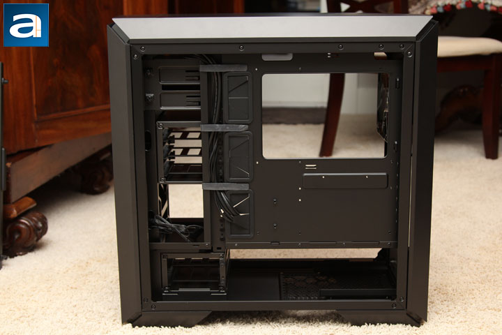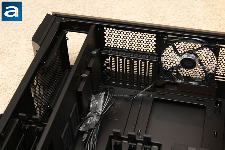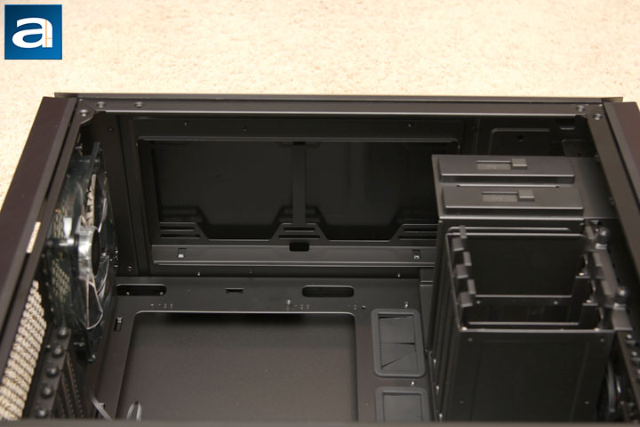 After removing the windowed side panel, you can see the internal design of the MasterCase Pro 6. To be consistent with the exterior, the interior of the case is painted black. The paint is sprayed evenly inside the chassis. At bottom of the case, there is a PSU chamber with a mounting rail, which allows the PSU to be pushed in from the outside. The other side of the PSU chamber is actually the side panel. Not only is the chamber designed to accommodate the power supply, it is also the place for you to put up to two 3.5” HDDs. The cool air for the power supply can be blown into the case through the dust filter protected ventilation holes at the bottom of the case directly. If your MasterCase Pro 6 is fully loaded with fans, graphics cards, and long radiators on top, cool air can be pumped in by up to three of the 140mm fans into the chassis through the air filter at the front panel, hit the graphics card, and be expelled out through the maximum 297mm radiator on the top panel. If the user only plans to use a small radiator or just a CPU heatsink with the top ventilation grille covered, hot air can be expelled out through the rear exhaust grille on the back panel. To my surprise, as aforementioned, two 5.25” drive bays are present in this chassis, and they are removable.