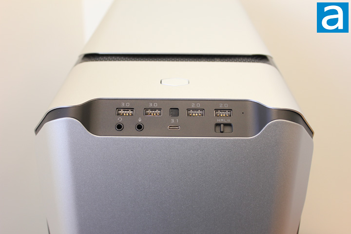 All the front I/O ports and switches are located on the edge where the front and top panel joins with each other. There is a little flat surface that divides the front and top aluminum panels. All of the front I/O ports and fan speed switch are located on that little flat area. Note the power switch is on the top aluminum panel and has the shape of the Cooler Master logo. There is no reset button on the SL600M. For the front I/O ports, we get two USB 3.0 ports, two USB 2.0 ports, one USB 3.1 Type-C port, and audio jacks for headphone and microphone, respectively. In the introduction, I mentioned the computer case is smart enough to illuminate the backlit USB ports automatically when the user needs to get access to those ports in the dark. This function is realized through a motion detection sensor located between the USB 3.0 and USB 2.0 ports. Once the sensor detects the presence of the hand movement near the USB ports, the USB ports are illuminated. I think this feature is very useful for places like the bedroom, since no one wants to see light coming from the computer when he or she is trying to sleep until they need to access the ports.