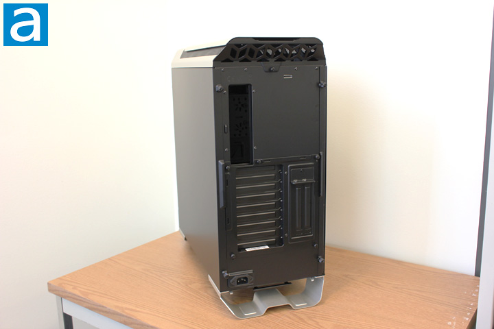 The back of the Cooler Master MasterCase SL600M, like the rest of the case, is simple and clean. There are two major sections; namely, the motherboard I/O backplate and expansion card slots. The position of the motherboard I/O backplate is as expected. However, for the expansion card slots, there are two groups of them on the bracket. The group of expansion card slots on the left hand side is the conventional configuration, and there are nine slots in total. On the right hand side of the conventional PCI expansion card slots, there are two slots for the vertical graphics card mounting. You can also rotate the PCI bracket for better clearance from the glass side panel to the graphics card. It is worth mentioning that, in order to mount the graphics card vertically, users need to buy the riser cable themselves, since it is not included out of the box. You may have noticed that, for the SL600M, there is no PSU mounting plate and rear exhaust at the back of the case. The PSU is actually mounted behind the front panel, which we will get there later. A standard power plug can be found near the bottom left side of the back panel. The lack of rear exhaust is due to the vertical chimney effect layout of this case. The air intake is at the bottom of the case, and the exhaust is on top of the case, therefore there is no need to have the rear exhaust. The back side of the MasterCase SL600M looks cleaner than most of the conventional computer cases in the market, thanks to its unique PSU mounting position, and the use of vertical chimney effect layout.