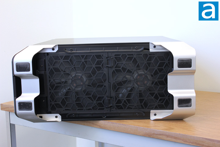 There are two aluminum stands at the bottom of the case to support the heavy Cooler Master MasterCase SL600M and rise the case up about four centimeters on top of the resting surface for better ventilation performance. These stands may not look very thick in the picture, but they are actually extremely strong. I guess the material used by Cooler Master is the high quality aluminum alloy, although they did not use "military grade aluminum" in the advertisement like Ford, haha. You may not be able to tell from the picture, but the stands are a little bit rough on the edges. I think these stands need some better machine work, or at least a little bit of grinding, so that the chance of users getting cut by the sharp edges can be reduced. Four rubber bricks are provided to enhance the grip of the stands. These rubber bricks can offer enough friction to hold the case in position firmly. You can also see from the above photo a washable filter is attached to the bottom grille of the chassis. The filter is reinforced by a hard plastic structure, and they are removable for cleaning as well. Note the case features a chimney-like layout, therefore there are two giant fans mounted at the bottom of the case. The fans are included in this case, and they are 200mm in size. The fan speed can be adjusted from 400RPM to 800RPM through the switch under the USB ports. These two huge fans should definitely help with the cooling performance of the SL600M.