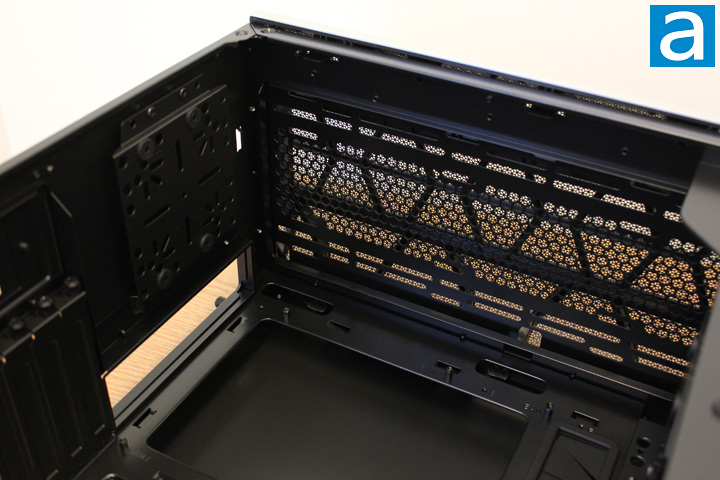 In order to get access to the power supply chamber, the chamber cover panel needs to be removed. In the above picture, the cover is removed so we can see the enclosure itself. The power supply holder is removable and it is mounted on the computer case frame using four thumbscrews. There are two arrays of mounting holes for the chamber and as such, the mounting position and the length of the enclosure can be adjusted according to the size of your unit. Behind this box, a power cable is available to extend the power connector of the power supply to the back of the case. Basically, the chamber design of SL600M gives the user a high degree of freedom in terms of mounting the PSU in the case. Meanwhile, the space between the PSU and the front panel forms a ventilation channel.