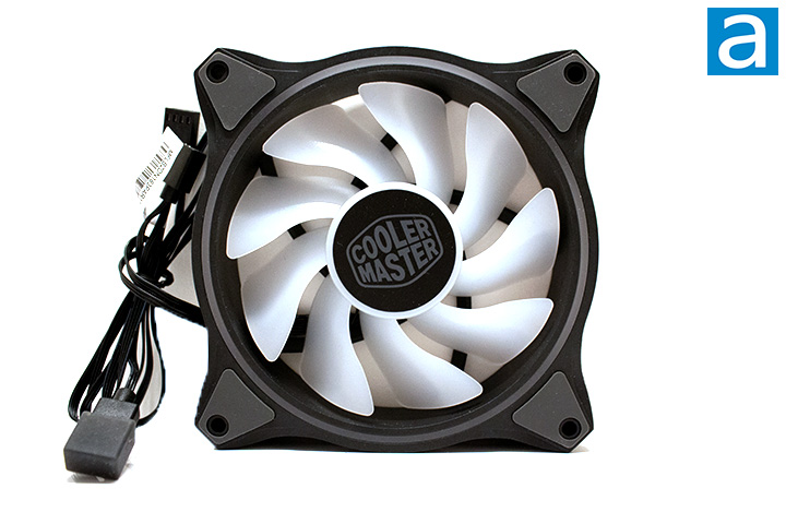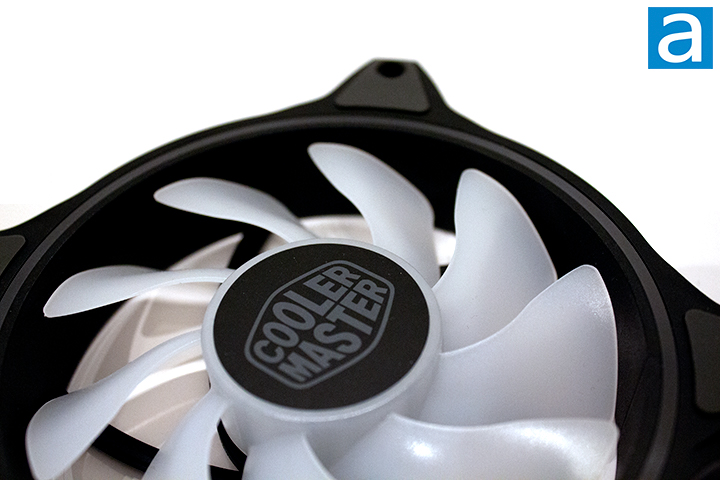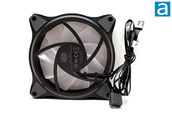 Although fans are typically not thought of to be an aesthetic feature of a computer, the current trend of RGB is making its way to make everything in that way. The plastic frame of the fan is black in color with a small portion of translucent plastic forming a ring around the fan giving the “halo” design. The fan blades are also translucent, likewise to many other RGB fans, helping disperse light out, as we will see late on. The middle of the impeller is also translucent, but is mostly covered by a Cooler Master sticker. On the edges around the mounting holes, you can see the grey pads. These pads act as dampeners for the fan, reducing vibration noises the fan may make when mounted. Overall, we can see the design of the “halo” implied by the name of these fans in the ring on the frame.