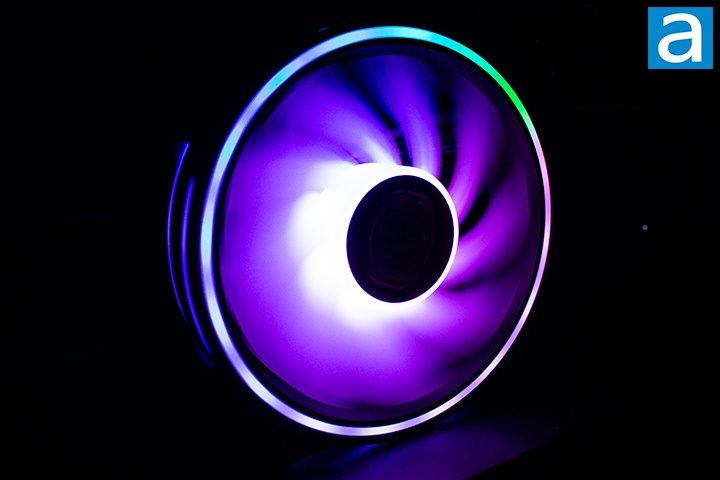 Moving on to arguably the most important feature of this fan, the RGB LED subsystem. The Cooler Master MasterFan MF120 Halo has a heavy emphasis on its aesthetics. Because we received the three-pack version of the fans, we also received the Wired Addressable RGB Controller. When using this controller, there are six different lighting configurations: Rainbow spiral, breathing rainbow, static red, blue, and green, and off. This controller does not bring much versatility for the large range of colors the MasterFan MF120 Halo is capable of. Where the ARGB can truly shine is when the fans are connected directly to an ARGB header on your motherboard. When connected to the motherboard, the lighting configurations can be controlled through motherboard lighting software such as Aura Sync, Polychrome Sync, and Mystic Light Sync. Interestingly enough, the MasterFan MF120 Halo does not have its own dedicated software like many other Cooler Master products. I personally feel like there is a lot of missing potential for these fans as they are restricted to the lighting configurations of the motherboard manufacturer. I hope Cooler Master is able to come out with a software update that takes into account of the MasterFan MF120 Halo in the near future.