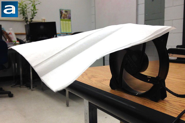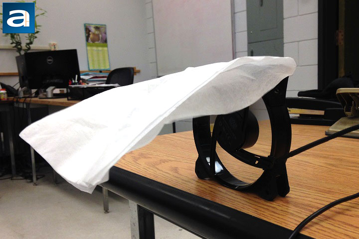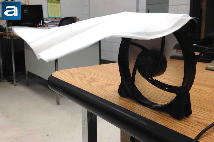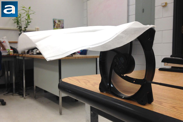 To test the performance of the MasterFan Pro series, the APH Networks proprietary testing method invented right here at APH Networks was used. This brilliant idea allows you to test your fans with minimum cost: A piece of tissue paper and some duct tape. The test results can qualitatively indicate the airflow, airflow consistency, and amount of static pressure generated by the fan. The experiment settings were straightforward. As shown by the above photos, a piece of tissue paper was attached on top of a fan. The tissue paper should be able to naturally fall down and cover the air outlet side -- the side where the motor rack is located -- of the fan. The test subject should be put near the edge of the table, such that the experimental results will not be affected by the reflecting airflow. Once the fans were powered on, the airflow, airflow consistency, and the amount of static pressure can be evaluated by observing the behavior of the tissue paper. Finally, the fan needs to be tested in all of its RPM ranges. In this review, only the photos of the highest RPMs were shown for the five MasterFan Pro units, since they represent the best performance regarding the airflow and air pressure of all fans.