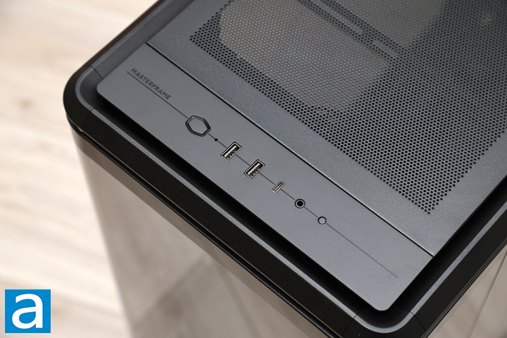 The top is where the user-facing I/O on the Cooler Master MasterFrame 360 Panorama resides. This area looks the same as the MasterFrame 600. These inputs and outputs are placed at the front in a row across the top panel. From left to right, we start with a power button and a pinhole opening for LED status lights. It glows blue on power on, and flashes red for drive activity. Next, we have two USB 3.1 Type-A ports, a USB 3.2 Gen 2 Type-C port, and a single combination 3.5mm audio jack for TRRS audio connections. Finally, we have a small reset button to reset the PC. Behind the row of I/O is a separate panel with many small ventilation holes. This ensures air can flow through the top region. As you will see, all these panels are held in with magnets to the frame of the enclosure.