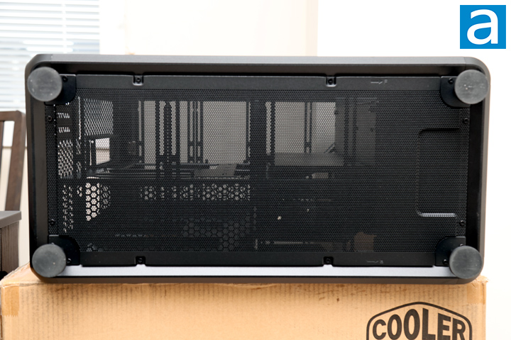 Underneath the Cooler Master MasterFrame 360 Panorama, there are a few things to note here. In the middle is a large, perforated panel with many smaller holes. This steel panel acts as the filtration. Unfortunately, it is screwed in place and not easy to remove without flipping the whole enclosure on its side. This makes the bottom filter more difficult to clean. Bottom mesh filters are standard in most cases, and this feels like a downgrade to maintain, even if it looks nicer initially. In the corners, there are four feet to raise the MasterFrame 360 Panorama off the ground. They are easily removable by unscrewing them, but with the feet attached, there is an air gap of approximately 38mm. This should be more than enough space for air to flow through. Regardless, I would recommend putting your case on a flat and solid surface to ensure nothing inhibits the air.