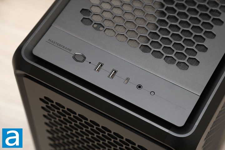 The top shows off the user-facing I/O on the Cooler Master MasterFrame 600. These inputs and outputs are placed at the front in a row across the top panel. From left to right, we start with a power button and a pinhole opening for LED status lights. It glows blue on power on, and flashes red for drive activity. Next, we have two USB 3.1 Type-A ports, a USB 3.2 Gen 2 Type-C port, and a single combination 3.5mm audio jack for TRRS audio connections. Finally, we have a small reset button to reset the PC. Behind the row of I/O is a separate panel with ventilation holes. This ensures air can flow through the top region. As this area is modular, you can swap the front and top panels around to put the front facing inputs and outputs at the front of the case. All these panels are held in with magnets to the frame of the enclosure. This is part of what makes up Cooler Master's FreeForm 2.0 design concept.