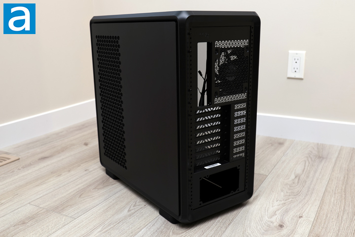 Looking at the other side, there is a solid steel panel with a column of ventilation near the front. This ensures air can flow in and out of the case when you mount fans or radiators along the side. Once again, this area is lined with plastic mesh to prevent dust from flowing through large holes. At the back, there is a large slot at the top for the motherboard I/O with a ventilation area to mount a single 120mm exhaust fan or radiator. It is strange that they do not have support for a larger 140mm fan. Underneath, there are eight expansion slots, which are all perforated for more airflow. They are held to the rest of the case with standard screws. Finally, at the bottom, there is a bracket with an opening for an ATX-sized power supply.