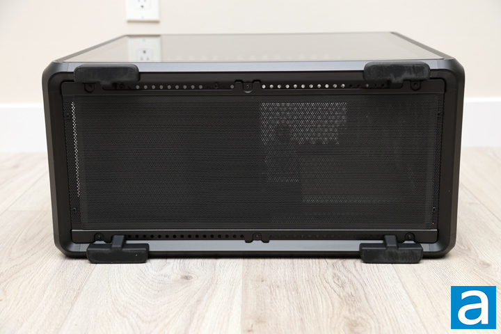 Underneath the Cooler Master MasterFrame 600, there are a few things to note here. In the middle is a large, perforated panel with many smaller holes. Cooler Master has also added some filtration in the form of a plastic mesh sheet, which is attached with screws to the bottom. Unfortunately, this makes the bottom filter much harder to clean, since it cannot be easily removed without flipping over the case. The same can be said for all the mesh filters on this case, which is a downgrade from every computer chassis we have seen in the past few years. Even if the panel can be easily removed, I want the filter itself to be removable for quicker access and cleaning ease. In the corners, there are four rubber feet to lift the MasterFrame 600 off the surface it is sitting upon. As you can see, the frame protrudes out further than the bottom face, so while the feet only raise the rest of the case by 14mm, there is a gap of 20mm between the surface and the inner mesh flat area. Regardless, I would recommend putting your case on a solid surface to ensure there is sufficient air supply.