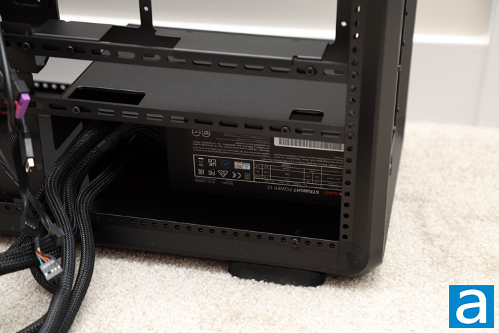 As always, the first step in my building process is to install the power supply, which I fitted into the basement. I installed the be quiet! Straight Power 12 1200W with the necessary cables attached and held it up for mounting at the back. Once again, I feel like the lack of support here is very strange. I would also have liked the power supply to install from the back with a removable bracket. The Straight Power 12 1200W measures 18.0cm in length, which is well within the maximum clearance of 23.5cm. I would not get too close to the limit length, as you will still need space for the cables and hiding any excess length. I continued my building process by leading the required cables into place.