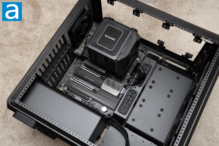In the main compartment of the Cooler Master MasterFrame 600, I mounted my ASUS ProArt X870E-Creator Wi-Fi motherboard with an AMD Ryzen 7 9700X mounted inside. Beside it is a set of Crucial Pro Overclocking DDR5-6400 2x16GB memory. The cooler on top of the processor is the be quiet! Dark Rock Elite. Cooler Master states a maximum air cooler height of 190mm, which is more than enough space for tall CPU coolers.