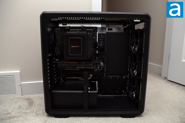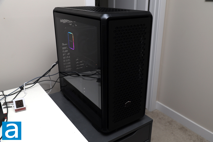 With both side panels installed, I connected everything and hit the power button on the Cooler Master MasterFrame 600. Everything whirred to life, which is a good sign. The MasterFrame 600 looks like any other unassuming black case with everything installed inside. We do not have any included lighting elements out of the box, so the only lights I saw were on my CPU cooler. The tinted window also hides any messiness, which is appreciated in the MasterFrame 600. Using our standard APH Networks sound scale, where 0 represents silence and 10 indicates loudness, the Cooler Master MasterFrame 600 is a 5.5/10 at full speed, and a 4.0/10 in regular operation. The Cooler Master Mobius fans are not quiet, but they can move air through the MasterFrame 600. As for noise suppression, there are no damping materials for this purpose.