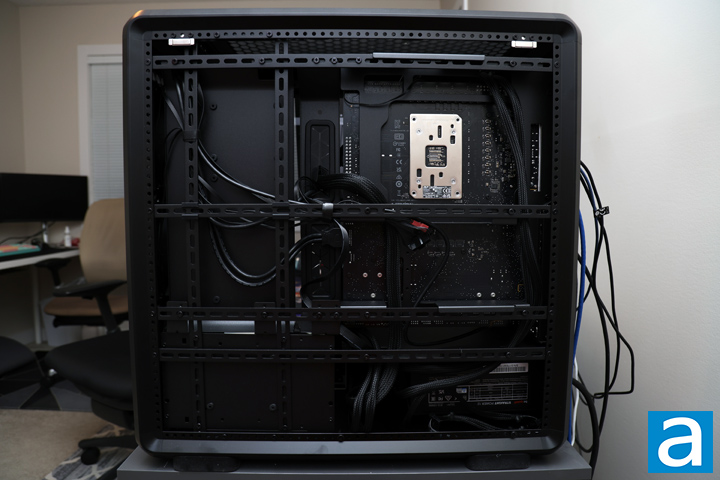 After finishing building my system, I can point out two areas with which I was not impressed. For one, the MasterFrame 600 is not friendly with any headers mounted on a 90-degree angle down the right side of the motherboard. This is because the routing hole bar partially blocks these headers. I had to slot the USB cable very uncomfortably in place, but I could not attach any SATA cables on the side here. Thankfully, my motherboard has a few more SATA headers on the bottom edge if I need them. The other annoyance is how disorganized it looks here. I could have spent a bit more time cleaning this up, but I also think Cooler Master does not do much to enable these efforts. We do not have any cable valleys in convenient spaces, and everything is exposed and made messy with the horizontal and vertical rails. There is enough space back here for all your thin and thick cables, but the whole implementation back here feels unusual.