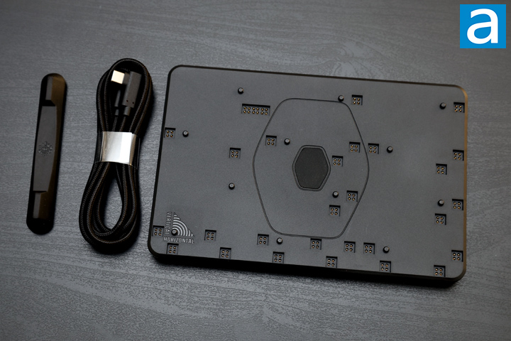 The Cooler Master MasterHUB is modular, but everything attaches to the base module. This black plastic slab is uninteresting, as it acts like a motherboard to connect everything together. However, there are some notable things to point out. For one, there are many indentations with pogo pins in various places. This is how all the modules connect and interact together. The grid and array of pins may seem a bit random, but I can assure you this will accept any permutation of modules, regardless of vertical or horizontal orientation. There are many plastic pegs to help with aligning and keeping modules in place. A large Cooler Master logo outline is in the middle to keep to the brand identity. The edges have the product name engraved into them.
