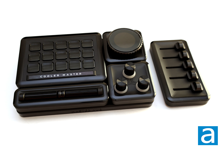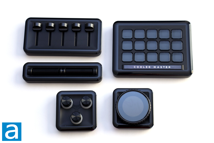 All the modules are similar in design. They have a glossy curved border with all the buttons, dials, knobs, and sliders in the middle. From the top, there are five faders that are individually adjustable. Underneath each slider, there are addressable RGB LEDs that illuminate as you move the slider up. The handle on each slider is metal, while the sliding action is both smooth but resistant to accidental movement. Next, we have a grid of fifteen plastic buttons. Each button has a small screen behind it to display a 480x272 image. This is useful for differentiating different actions and moving them around as you see fit. The last module included with the base kit is the set of two rollers. These occupy a single row and each of the rollers is metal. They have a tactile notched feel that allows for stepped movement.