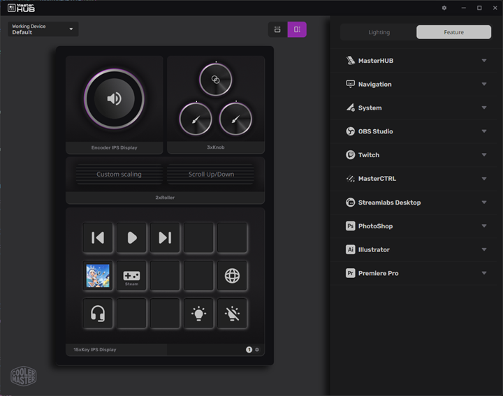 "Feature" is the name of the second tab. This is where the bulk of the changes occur for setting corresponding actions to a button, knob, wheel, or slider. Depending on the selected input, the right side of the menu changes to show applicable options. As for application support, we have actions for MasterHUB, system changes, MasterCTRL, and third-party software like OBS Studio, Twitch, Streamlabs, and three Adobe Creative Cloud Suite software in Photoshop, Illustrator, and Premiere Pro. These are not necessarily direct integrations, but rather macros of commonly used shortcuts. You can also create these macros and assign them. Unfortunately, it does not have the applications I use for my workflow, such as Audacity or DaVinci Resolve. For gaming purposes, I would also want to see some games listed and supported here.