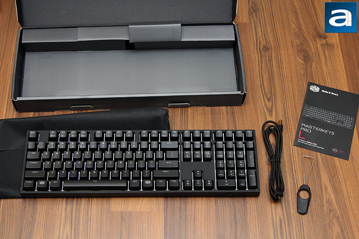 Contents inside the retail package can be removed after opening the large flap at the top. The keyboard is secured inside a cardboard tray inside a thin white foam bag. As you can see in our photo above, the bundle is totally minimalist. Out of the box, in addition to the Cooler Master MasterKeys Pro L keyboard, you will find a multi-language quick start guide and a keycap puller, and this is it. A driver CD is nowhere to be found, but this is okay, since you can do almost everything without installing extra software. This is not to mention a lot of new systems are not even equipped with optical drives. The MasterKeys series is not natively designed for a wrist wrest, nor is a detached one included.