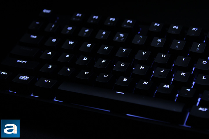 The Cooler Master MasterKeys Pro L's key illumination distribution is not even at all. For any key with more than one line of text label, you will notice the top half is lit, while the bottom is not. This is due to physical design limitations of Cherry MX switches. This is no different than any other backlit keyboard with Cherry MX switches, but this can usually be avoided by avoiding double line text labels as much as possible.