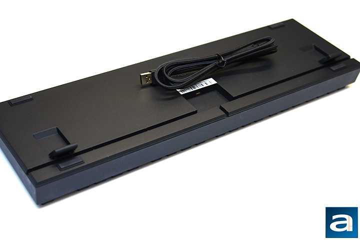 At the back of the Cooler Master MasterKeys Pro L is the USB cable lead out. The cable is detachable from the keyboard; in addition, an integrated cabling guide allows you to route it out either from the left, middle, or right of the back of your MasterKeys Pro L. This nicely braided cable extends 1.5m in length to connect to your computer via a gold plated USB connector. When we bring about the question of whether gold plated connectors are actually useful or not, let us just say if it was the actual pins, then possibly -- since gold offers better conductivity than other metals. This theoretically establishes a better connection with your computer, but on a digital signal level, we must understand it is a discrete one or zero; so if anyone tells you they can tell the difference, you can definitely defeat their theory with a double blinded test. Additionally, if you are referring to the gold part of the connector you see on the plug, I would like to point out it actually does not make any physical contact electrically with your computer. In other words, it is nice to have, and it is pretty to look at, but it is not anything significant on a practical level. The presence of a gold plated USB connector will not have any performance impact on the Cooler Master MasterKeys Pro L. The cable, on the other hand, is a bit short compared to the 1.8m to 2m length you usually get.