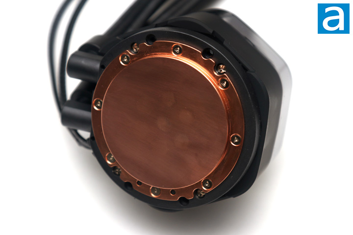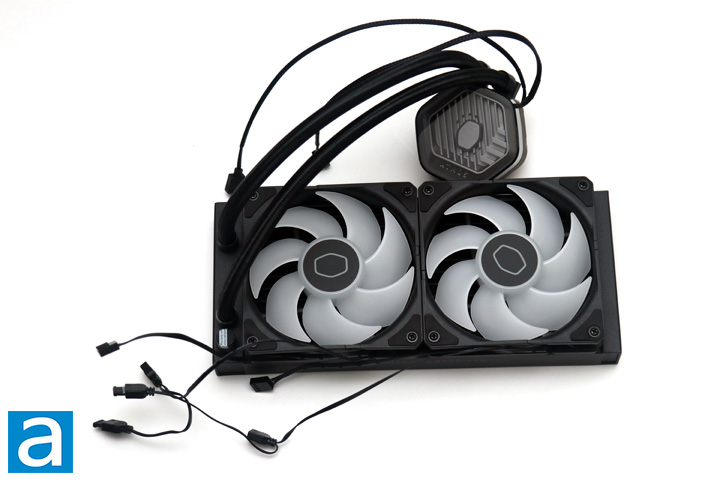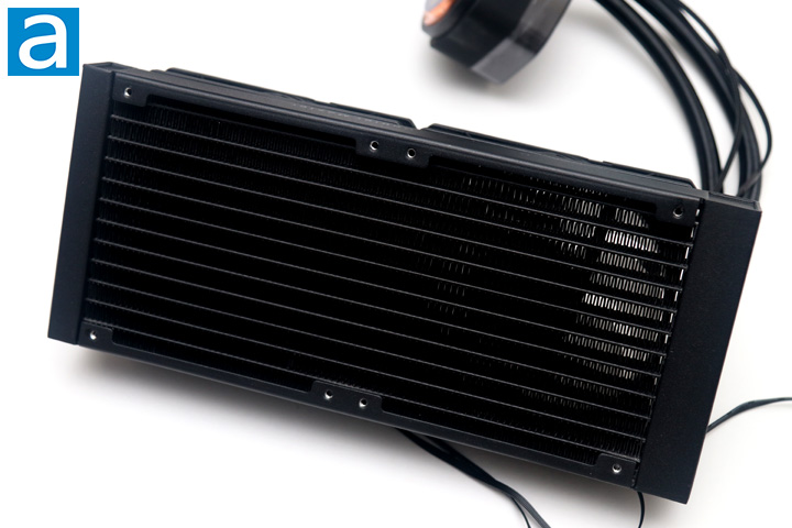The radiator measures 277mm long, 119.6mm wide, and 27.2mm thick. These are standard dimensions for a 240mm all-in-one liquid cooler. This size plays a significant role in cooling, as a larger surface area will result in better heat dissipation. The radiator is made out of aluminum, which offers decent heat transfer qualities. However, the primary advantage of using aluminum is for its low mass, which should reduce the strain placed on the case where this is mounted. Overall, the build quality is good on the Cooler Master MasterLiquid 240 Atmos, as there were no defects or nicks to be concerned about. Cooler Master has ensured that if you use the hardware provided here, the screws will not contact the fins below, so I would not be as concerned with users accidentally over-tightening the screws and causing damage to the fins.