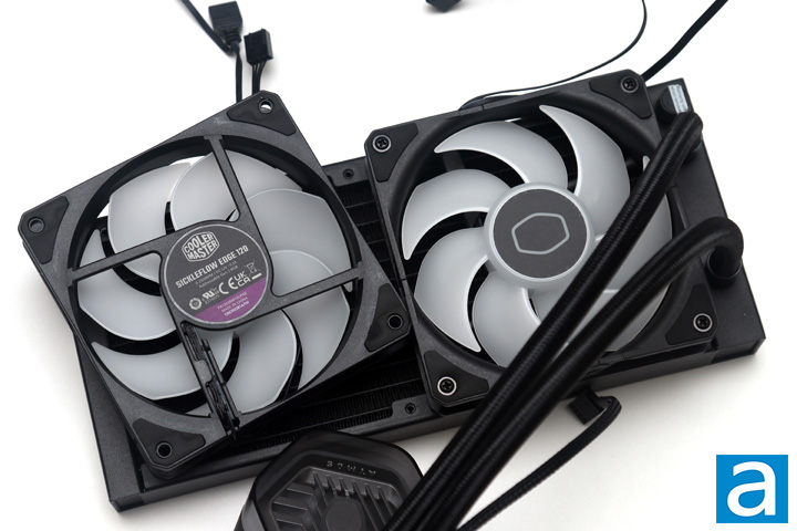 The Cooler Master MasterLiquid 240 Atmos comes with two 120mm Cooler Master SickleFlow Edge fans, which are an upgrade from past SickleFlow fans. Rather, these have loop dynamic bearings. Similar to fluid dynamic bearings, an internal oil circulates around the bearing through grooves, which oil the shaft in a well-greased manner -- pardon the pun. This is similar to what we have seen most recently on their Mobius 120 fans. Otherwise, we have a relatively long lifespan of 160,000 hours and a maximum noise output of 27.2dbA. In terms of performance metrics, each fan produces a maximum air pressure of 3.61mm H2O and an airflow rating of 70.7CFM. Compared to the fans we had from the MasterLiquid 240L Core ARGB White, we have a slight decrease in airflow, but a notable increase in air pressure. We will see how this affects the cooling capabilities in our tests later on.