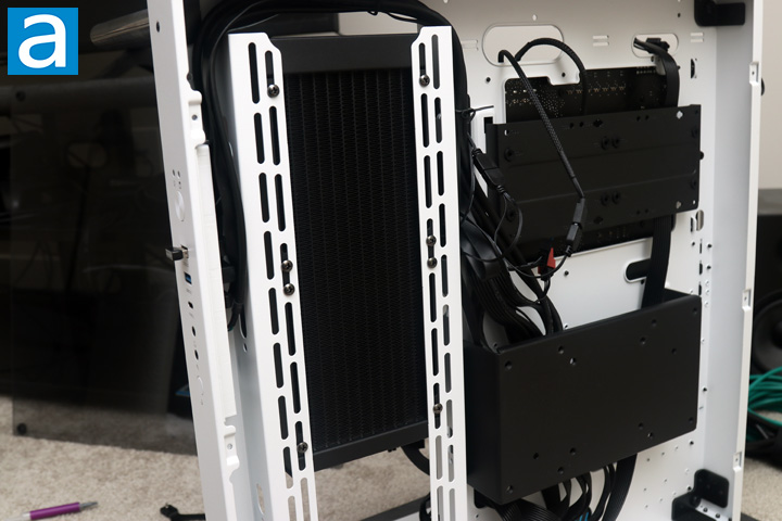The next step would be to either install the fans and radiator in the case or mount the water block onto the motherboard. I chose to go with the former and mounted my radiator with fans attached to the side of the case first. After mounting the radiator at the side of my case, I applied enough thermal paste, which is included from Cooler Master, and mounted the water block and pump combination on top of my Intel processor. Before I did this, I removed the protective label on the bottom of the block. Based on the instructions, Cooler Master recommends screwing this in using a cross pattern to ensure even tightening and pressure applied to the processor. As expected, I was able to complete the installation without any issues. I then plugged everything in to the necessary headers.