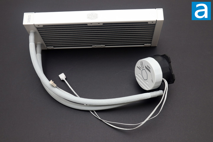 The Cooler Master MasterLiquid 240L Core ARGB White looks exactly what you might expect for a white AIO cooler. This includes a 240mm radiator that is connected to the pump and water block combination with tubing. All these elements are white, while the connection points between these parts are light gray. I do appreciate that even the cables and headers have this matching color, as this might be one area to easily forgo. There are still black portions on the liquid cooler, including the bottom portion of the CPU block, but mostly everything that is exposed to users matches this color scheme. Branding on the unit is present, especially on the long edges of the radiator and pump head. Otherwise, the materials used are as expected with a large aluminum radiator, rubber tubing lined with a mesh material for a distinctive look, and plastic exterior on the pump head.