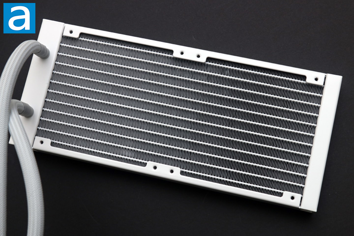 The radiator measures 277mm long, 119.6mm wide, and 27.2mm thick. These are standard dimensions for a 240mm all-in-one liquid cooler. This size plays a significant role in cooling, as a larger surface area will result in better heat dissipation. The radiator is made out of aluminum, which offers decent heat transfer qualities. However, the primary advantage of using aluminum is for its low mass, which should reduce the strain placed on the case where this is mounted. Overall, the build quality is good on the Cooler Master MasterLiquid 240L Core ARGB White, as there were no defects or nicks to be concerned about. However, I would have liked to see more protection under each mounting hole location to ensure if users accidentally screw in mounting screws too far, it does not penetrate the radiator fins underneath. If you use the hardware provided here, the screws just contact the fins below, so I would have been a bit more at ease if there was just a layer of metal to shield the area.