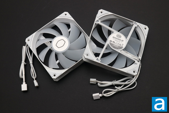 As indicated by the name, it should be no surprise we have addressable RGB fans included with the Cooler Master MasterLiquid 240L Core ARGB White. These two fans have rifle bearings inside with a specified lifespan of 160,000 hours. The rated noise level is a maximum 27.2 dBA, but we will see what this means when we evaluate noise levels. In terms of other numbers, each fan produces a maximum air pressure of 1.86mm H2O with an airflow rating of 71.93CFM. Each fan also has rubber dampeners in each corner to soften vibrations between the fan and radiator. Finally, these fans have two cables extending out. One is a 4-pin PWM header and the other is a 3-pin standard addressable RGB header. Cooler Master has included a 2-in-1 fan header cable and a 3-in-1 ARGB header cable so users can power and control the fans and the lighting elements with a total of two headers on the motherboard.