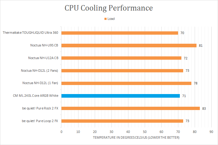 With more than enough time to load the processor, you can see how all the coolers performed with the peak temperatures recorded. From here, you can see the strong result of the Cooler Master MasterLiquid 240L Core ARGB White with a full load temperature of 71c. This was the second best result we had seen from all the coolers, which is impressive. This was one degree warmer than the TOUGHLIQUID Ultra 360 and two degrees cooler than the be quiet! Pure Loop 2 FX. This was also lower in temperature than our Noctua NH-U12A and NH-D12L. This AIO liquid cooler was clearly more than capable of ensuring enough headroom so that the CPU can maintain the same maximum frequencies as other coolers.