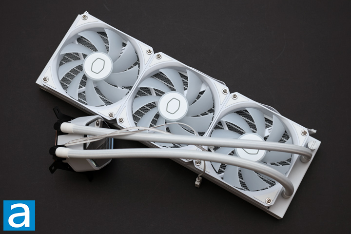 According to Cooler Master, the MasterLiquid Core II 360 White is part of their MasterLiquid Lite lineup, but its physical appearance does not necessarily align with this. For one, we have a standard design with the Master MasterLiquid Core II 360 White. Its conventional looks are only countered by an all-white finish, which is still not out of the ordinary. The tubes have braided sleeves for a clean finish. Furthermore, the branding on the radiator is limited to the logo on the water block and the fans. On the other hand, the top of the water block with an "infinity" mirror finish will draw people’s attention. Its design is visually appealing, especially when it is powered on and illuminated. The RGB LED lights shine on the edges and in the middle to make for a repeated effect. Also, because it acts like a mirror, you can see yourself when the block is not turned on. Several cables lead out of the water block to power and control the lighting and pump.
