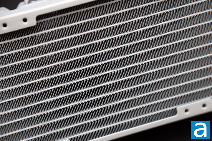 Upon closer inspection of the Cooler Master MasterLiquid Core II 360 White, we have a standard radiator fin layout. The fins are placed in this manner, so they contact the liquid running through the top and bottom. The result is a wavy set of fins, which are consistent in pattern and without any defects. Heat from the liquid runs through the radiator and transfers to the fins through the contact points. Fans are attached to the radiator to dissipate the heat. The liquid is transported around the loop via tubing. This measures 400mm in length, which I found to be just enough for my build. This does depend on where you mount the radiator in relation to the CPU block. When placed above, there is more than enough tubing, but if you place it on the front panel or the side of your case, you might see a bit more of a stretch. Finally, the tubes are strong and flexible and should not form any kinks, even in more extreme bends. They pivot on the water block for maneuverability. Cooler Master also includes some tube clips so you can position them better.