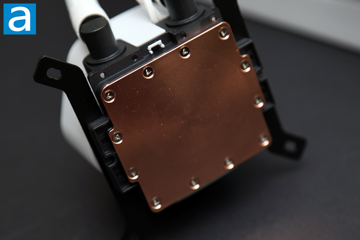 On the other end of the tubes are the combined contact plate, pump, and water block. This unit measures 83mm in length, 76.2mm in width, and 52.3mm in height. The base contacting the processor is an exposed copper plate. The base is flat, but does not show any circular polishing marks. Cooler Master has also installed the mounting arms on opposite sides of the block to minimize the installation steps. A label is placed on this area to prevent any surface scratches, so it is important you remove the label before installing it. Inside, we have a pump operating at 3000 RPM. It is powered and controlled through a 3-pin voltage-regulated header, which contradicts the specifications. According to Cooler Master, the pump has a mean time to failure of over fifty thousand hours and a maximum pump noise level of 25dbA. Surprisingly, this is a shorter lifespan than the previous MasterLiquid Core AIO cooler we reviewed.