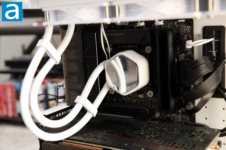 After mounting the radiator at the top of my case, I applied thermal paste, which should be included from Cooler Master, and mounted the water block and pump combination on top of my Intel processor. Before I did this, I removed the plastic protective sheet on the bottom of the block. Based on the instructions, Cooler Master recommends screwing this in using a cross pattern to ensure even tightening and pressure applied to the processor. I was able to complete the installation without any significant issues as expected. I also tried to tidy up the tubes with the clips, but ended up removing them because I did not find them useful.