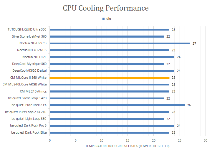 After letting my computer sit idle for a while, I checked the temperature of the processor. From the first graph, the Cooler Master MasterLiquid Core II 360 White idled at a temperature of 23c. This was among the lower numbers, and only a degree warmer than the lowest. However, idle results are only a partial representation of what CPU coolers can do, so we started up the Prime95 tests to see the more pertinent metrics.