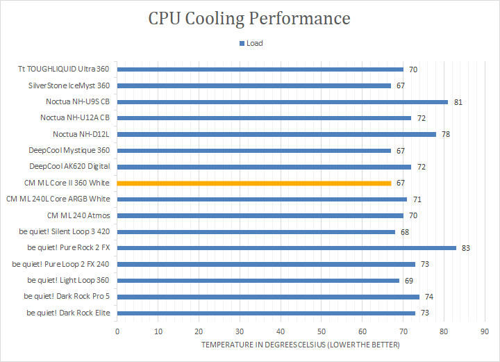 With more than enough time to load the processor, you can see how all the coolers performed with the peak temperatures recorded. The Cooler Master MasterLiquid Core II 360 White performed excellently, providing the lowest full load temperature of 67c. This is impressive as it was cooler than everything we have tested, even when compared to the larger 420mm or other 360mm options. Granted, the delta between most of these options was a degree or two, which is within the margin of error. Even so, I am still glad the MasterLiquid Core II 360 kept competitive. There was no thermal throttling noticed during our tests, as all cores were able to reach their boost frequencies for sustained periods.