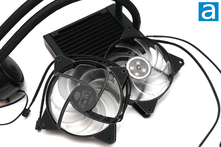 The two fans included with the Cooler Master MasterLiquid ML120R RGB are the MasterFan MF120R ARGB fans. These fans are rated to spin at speeds of 650 to 2000 RPM. The rated noise level is 6 to 30 dbA, though we will see what this means when we test for noise levels. However, you can tell these fans are created with a balance between airflow and air pressure, as there is quite a bit of overlap for each consecutive fan blade. In addition, the fan produces an air pressure of 2.34 mm H2O, with an airflow rating of 66.7 CFM. Otherwise, these fans also have installed foam dampeners in each corner to prevent vibration between the fans and the radiator. As you can tell by its name, these fans also have addressable RGB LEDs installed to make for a colorful display. These fans have two connectors with one for controlling fan speed and power, while the other used for the RGB header connection.