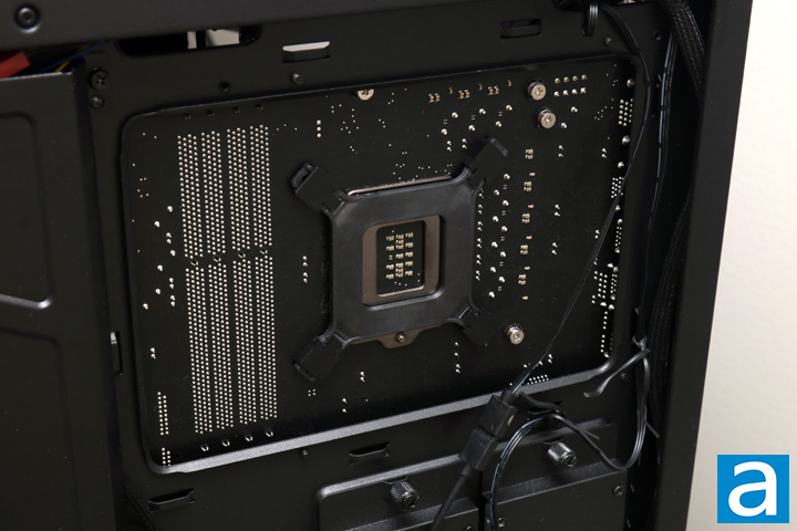 Installation of the Cooler Master MasterLiquid ML120R RGB is as simple as any all-in-one cooler, but I will take you through a step by step walkthrough. The first step is to take the correct backplate for your system. Both AMD and Intel backplates are provided with the ML120R RGB. For the Intel backplate, you can see there are two different positions for the pegs, which cover majority of the Intel sockets. If you are using an LGA20xx processor, four screw pillars can be used instead. Slotting it in through the back of the motherboard is painless, as is securing the backplate with the four included screws. Otherwise, the next step continues on the inside of the case.