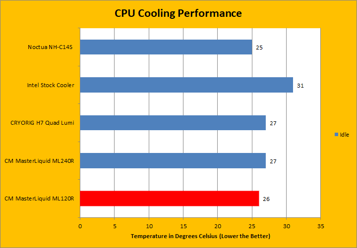 After installation and letting our computer sit idle, we recorded temperatures of approximately 26 degrees Celsius from the Cooler Master MasterLiquid ML120R RGB. While this is pretty average, this is still not the coolest we have seen. Comparatively speaking, this exactly between the CRYORIG H7 Quad Lumi and the Noctua NH-C14S. Even so, these numbers were under zero-load conditions, so we went to our load tests to see what the ML120R was actually capable of. Just to note, these idle numbers were also double-checked after our load test to ensure correct results.