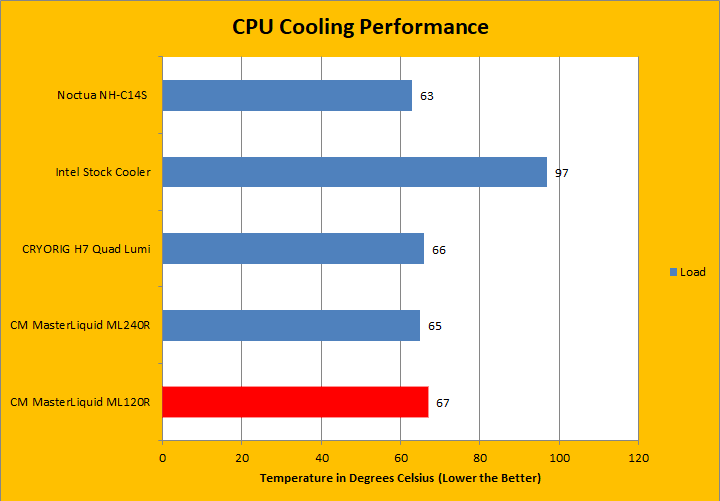 Powering Prime95 up and running the tests, the Cooler Master MasterLiquid ML120R RGB immediately came alive with all fans spinning to keep the unit cool. After approximately half an hour to let the temperature stabilize, we finished with a maximum temperature of approximately 67 degrees Celsius. Comparing with the other all in one cooler, the ML240R, this number was quite similar all things considered, with a difference in temperature of only two degrees. Once again, this is not any better than the two air coolers I have compared it with, the NH-C14S and the H7 Quad Lumi. This being said, you can see all of these coolers were within four degrees of each other, and at these full load conditions, this was still a pretty good result. In addition, you can see how poor the Intel stock cooler performs compared to any of these coolers.