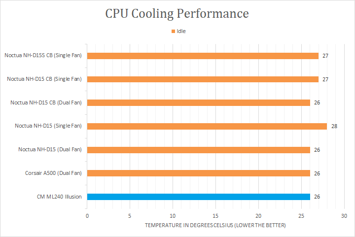 We tested the Cooler Master MasterLiquid ML240 Illusion against the Noctua NH-D15 and Noctua NH-D15 chromax.black in single and dual fan configurations. The Corsair A500 and Noctua NH-D15S was also compared. All air coolers on the list are among the best, if not the best, in the market today, making this an interesting performance benchmark. In our charts, we noticed some difference between the regular NH-D15 and its chromax.black version. Possible explanations for the variances in results can be found in our Noctua NH-D15 chromax.black review. Noctua assures us all NH-D15 models sold today will have identical performance, so we will use the chromax.black version as the standard, since the regular NH-D15 used in our tests was made in 2014.