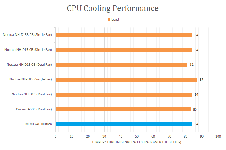 As you can see in our charts above, the Cooler Master MasterLiquid ML240 Illusion performed very well in our idle test. There is no significant difference between all the coolers and its varying configurations, because the processor in its idle state is not generating a whole lot of heat in the first place. Since the idle test is not a good indicator of a CPU cooler's true performance potential, let us look ahead into the load test results.