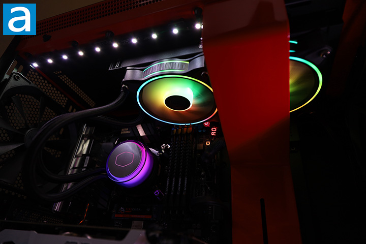 While this is very subjective, I am quite a picky person on noise and my computer is usually close to completely silent in normal operation. On a scale from 0 to 10 where 0 is silent and 10 is the loudest, I would rate the Cooler Master MasterLiquid ML240 Illusion equipped with two MasterFan MF120 Halo fans to be at 4.0/10 acoustically with its fan running at full speed. This was the same rating I have given to the NH-D15 chromax.black with a single fan. However, when my computer is idling or under nominal loads -- where it spends most of the time doing on a daily basis -- the water pump and PWM fans slowed down was almost inaudible at 1.5/10. There was no noticeable pump or turbulence noise associated with this cooler. Needless to say, I was both pleasantly surprised and impressed. Overall, in terms of sound emissions, the Cooler Master MasterLiquid ML240 Illusion is a no doubt excellent choice for quiet PC enthusiasts. If you like epic addressable RGB LED effects to go with it all, this is the cooler to get.
